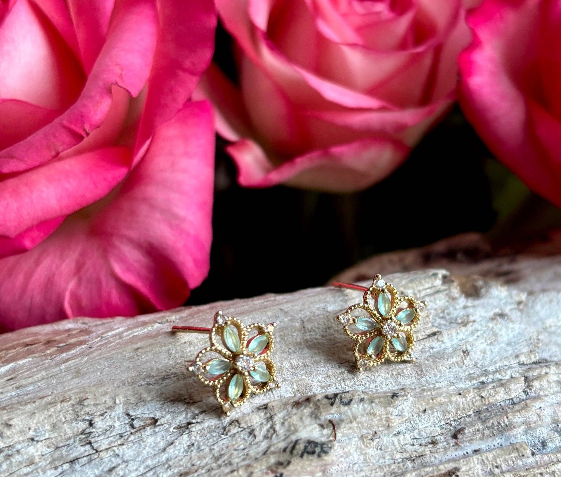 14ct Gold Plated Cubic Zirconia Green Petal Flower Earrings OR56