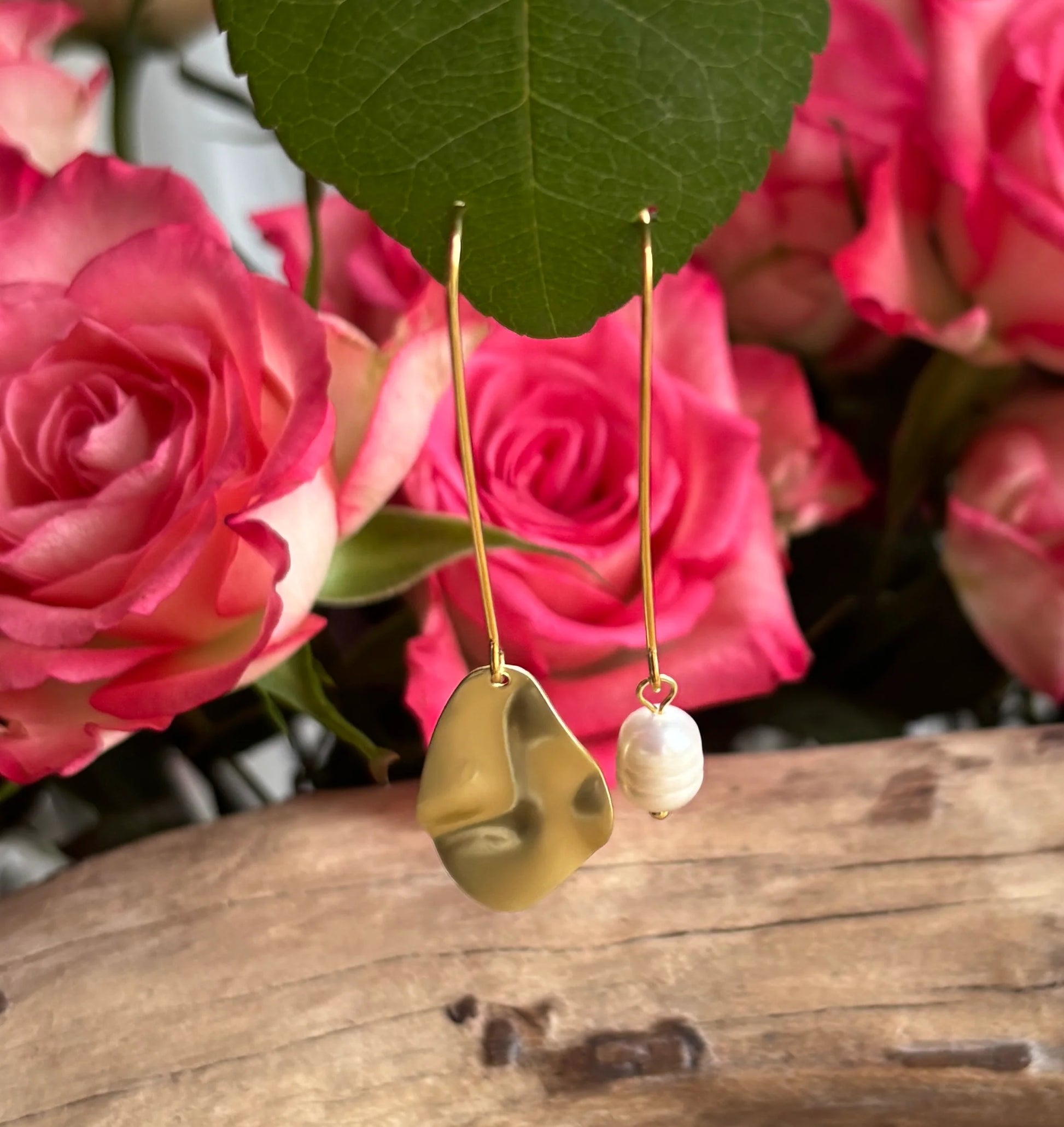 These funky, quirky 14ct gold plated earrings feature a mismatched design that adds a playful touch to any outfit. Both earrings fall gracefully from the ear on an elegant gold stem, with one finished off by a lustrous pearl and the other by a delicate leaf.