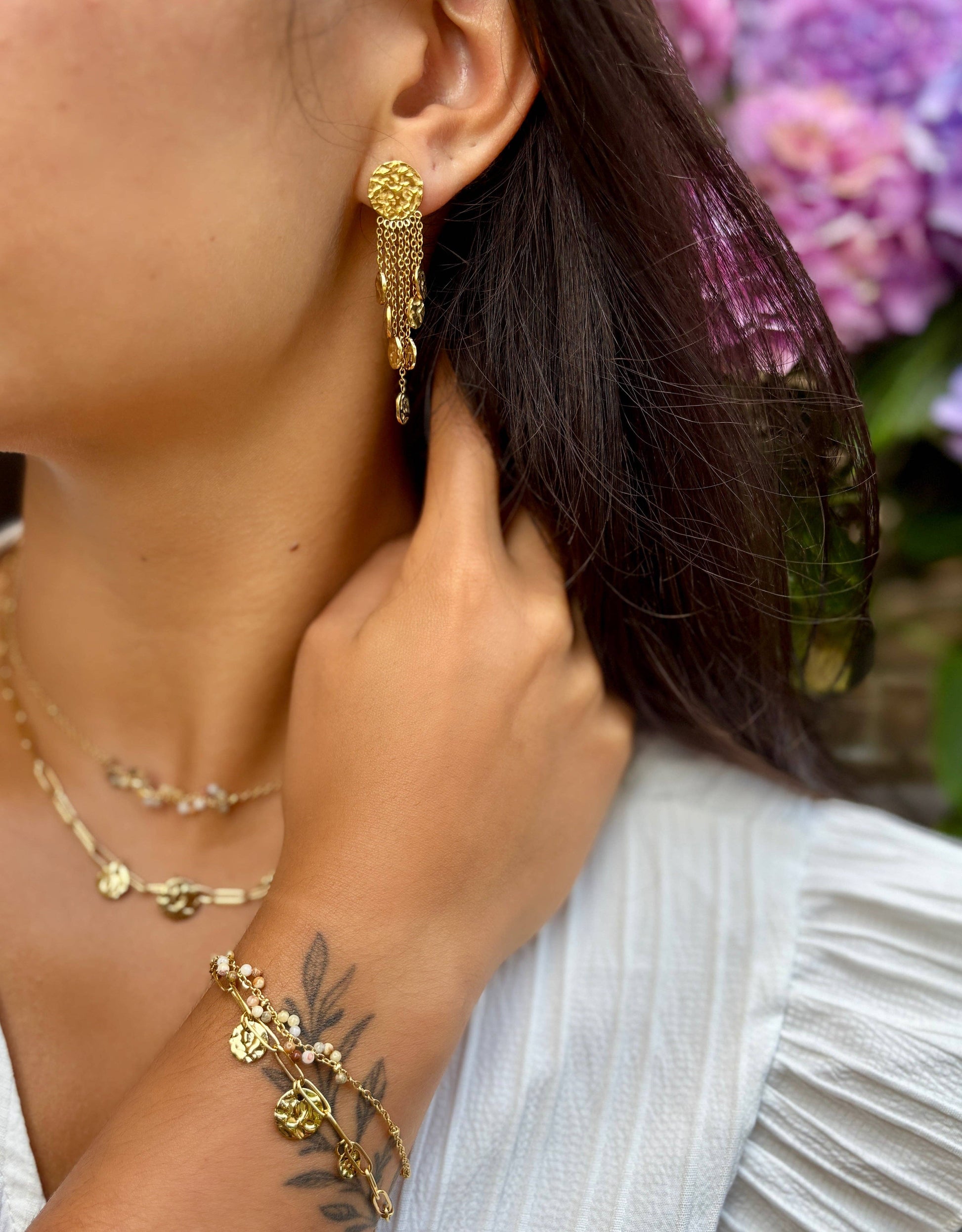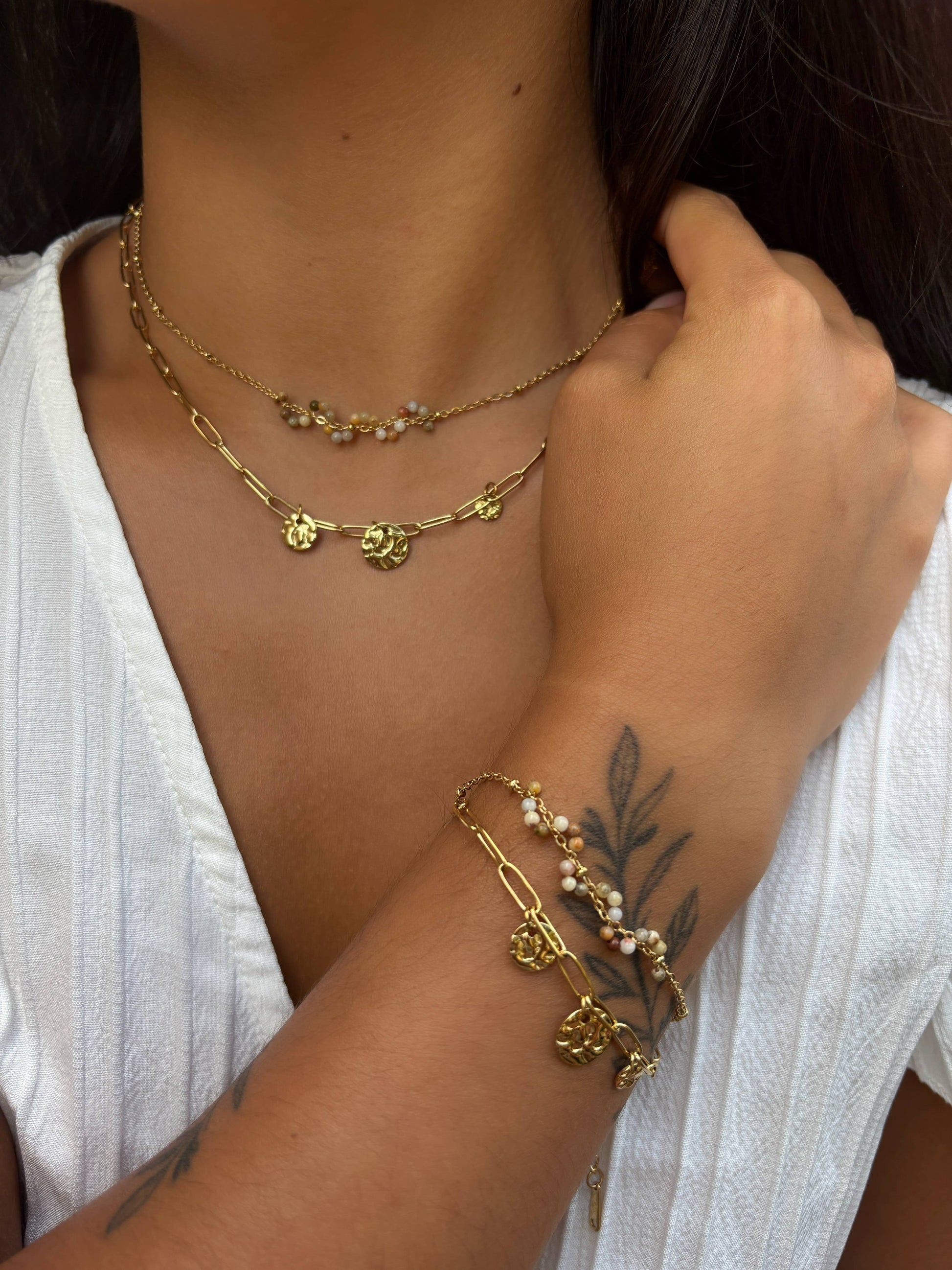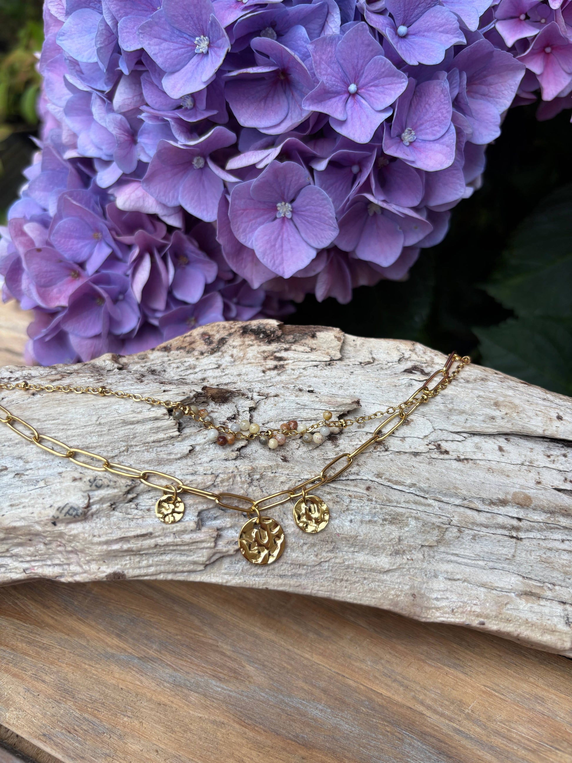 A double-layered gold chain adorned with delicate tourmaline beads, accented by shimmering gold discs for a refined, feminine touch.
