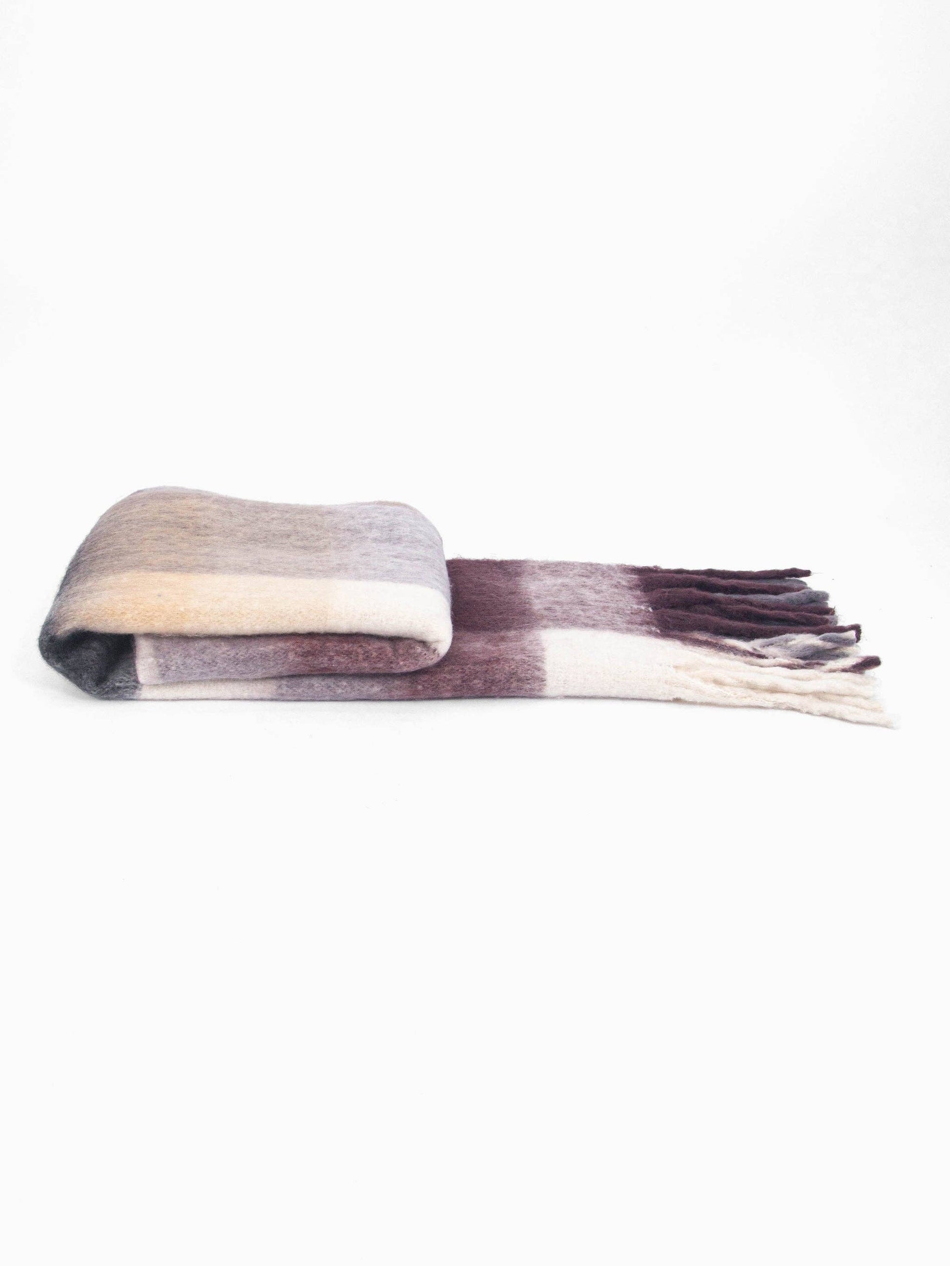 An oversized winter scarf crafted from soft to the touch viscose. Showcasing a multicoloured square colour block design in dark neutral tones and a bohemian influenced tasselled fringe. Effortlessly pair with outdoor winter attire.