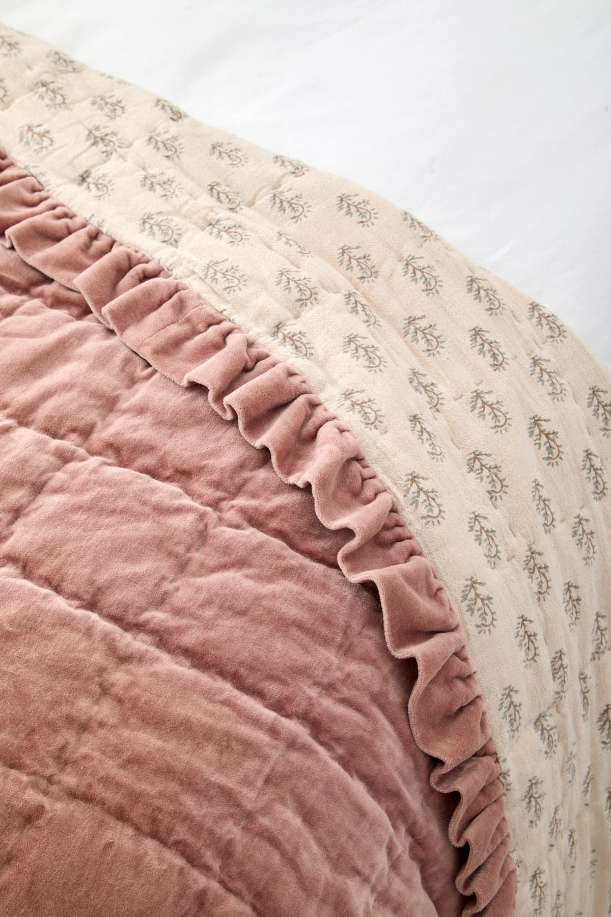 Cotton velvet bedspread in rosewood with a contrasting cotton/linen printed reverse. Finished with a velvet ruffle border round all four sides.