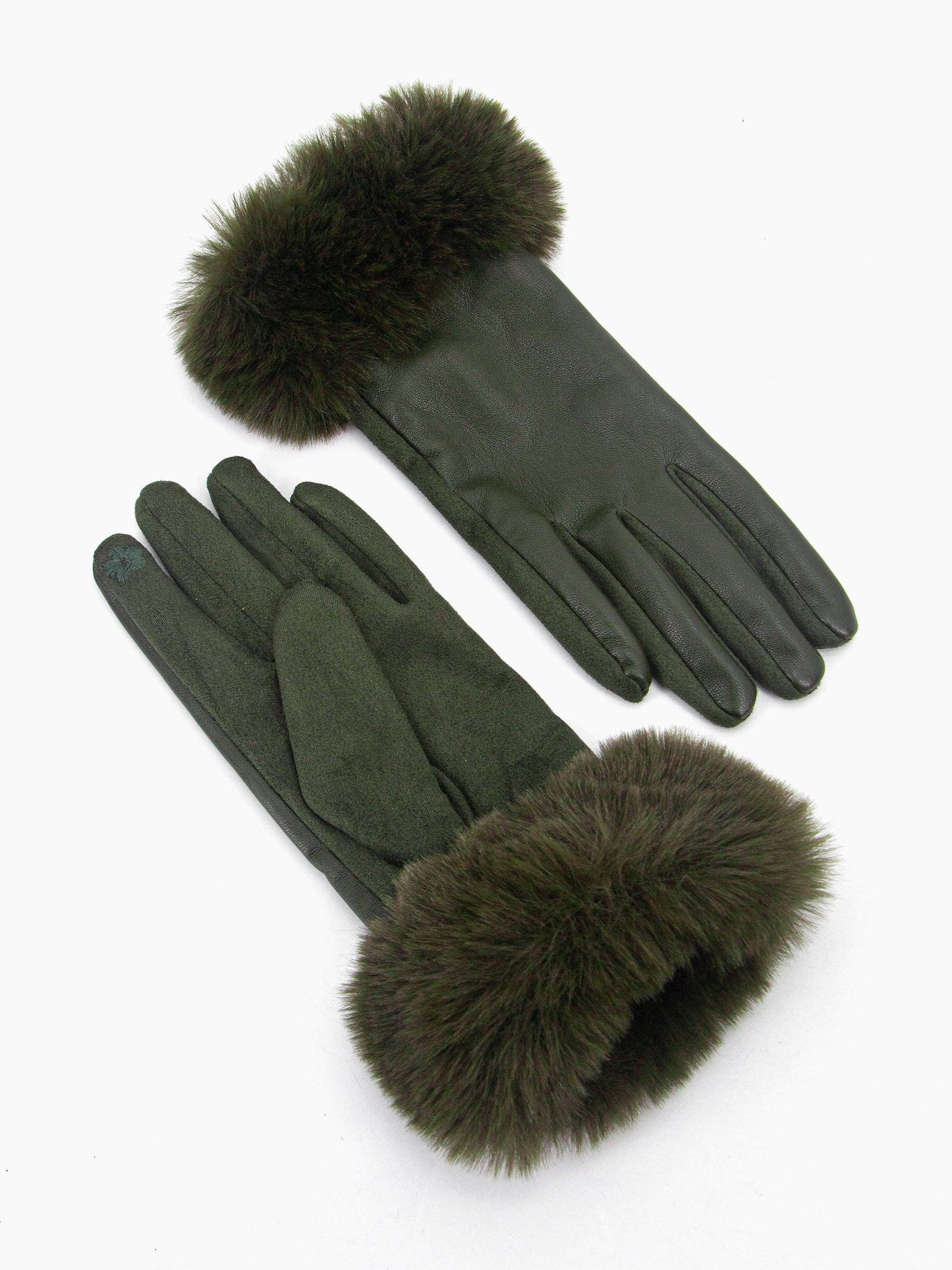 Maya Faux Fur Cuff Gloves - Khaki, PU: One-size