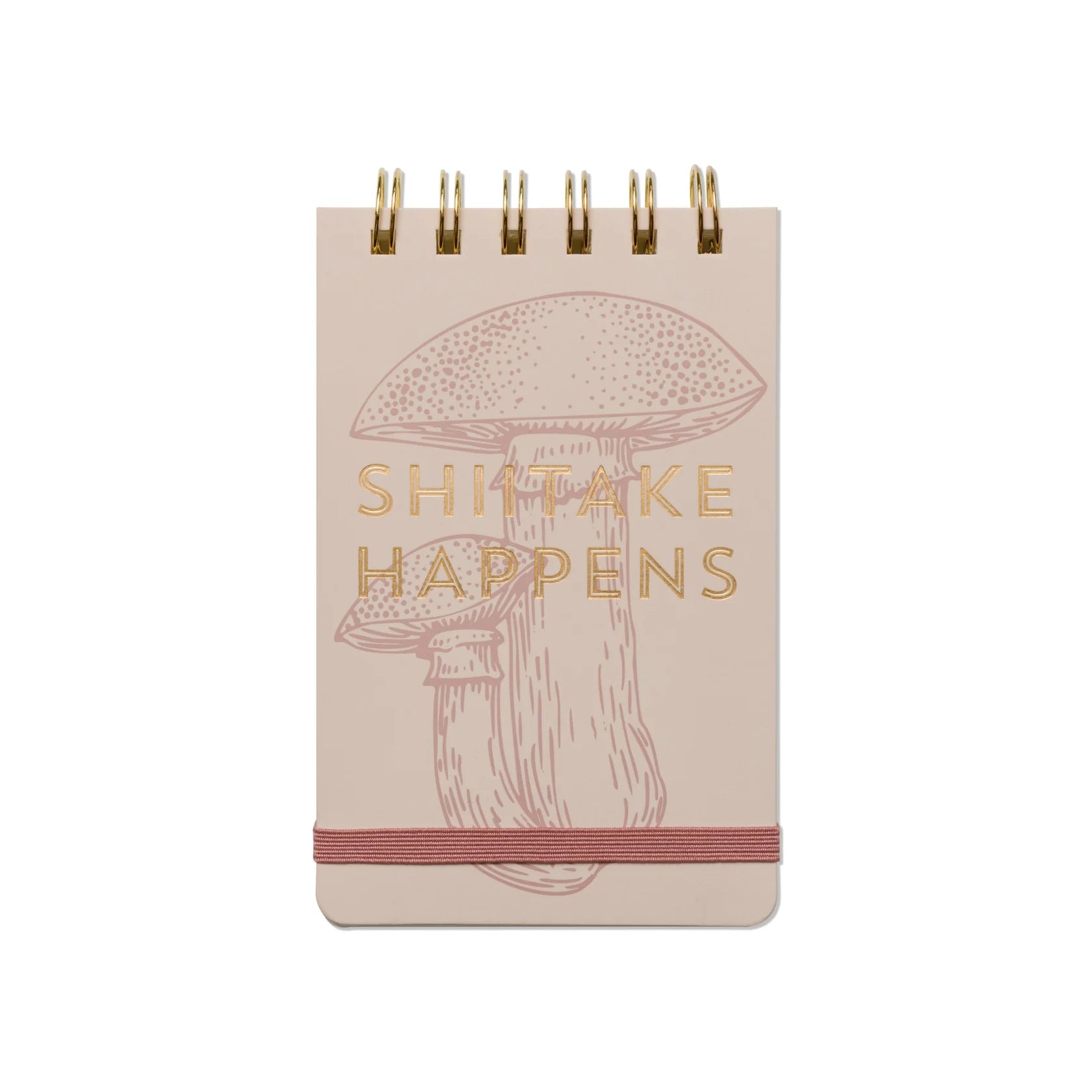 This flip-over notepad is adorned with a mushroom illustration to match punny, gold foiled “Shiitake Happens” script. The interior of the mushroom notepad features lined pages with an elastic closure to keep everything secure on the go. Perfect for jotting down notes, lists, and secrets!